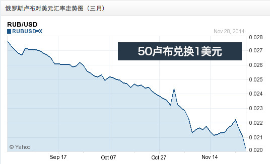 目前,俄罗斯经济的确承受了巨大压力,这一点从卢布过去一年的汇率走势可以看出来。就在几天前,普京总统在接受俄罗斯塔斯社采访时说,油价下跌导致俄罗斯货币卢布贬值30%左右。不过,他也半开玩笑地说,货币贬值有弊有利。比如,从前出口价值1美元的产品获得32卢布,如今能得到45卢布,政府预算收入不但没有减少,反而增加。然而,玩笑归玩笑,几天之后,卢布汇率就已经下跌到接近50卢布才能兑换1美元。这是一个能让普京笑容僵住的数字,说俄罗斯经济濒临崩溃并不算太夸张。