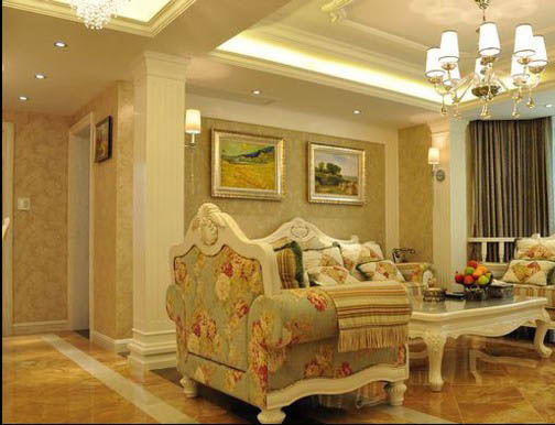 客厅沙发背景墙是整套房间最鲜明的位置,在这里悬挂欧式花纹、金色色彩边框的油画,与整体家具以及墙面壁纸形成最舒适的搭配,对称形式的2副风景画面给人宁静自然的温馨视觉享受。