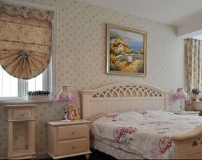 卧室床头墙悬挂同样感觉的欧洲乡村场景,与墙面浪漫小花儿壁纸映衬,打造卧室舒适小温馨气息。