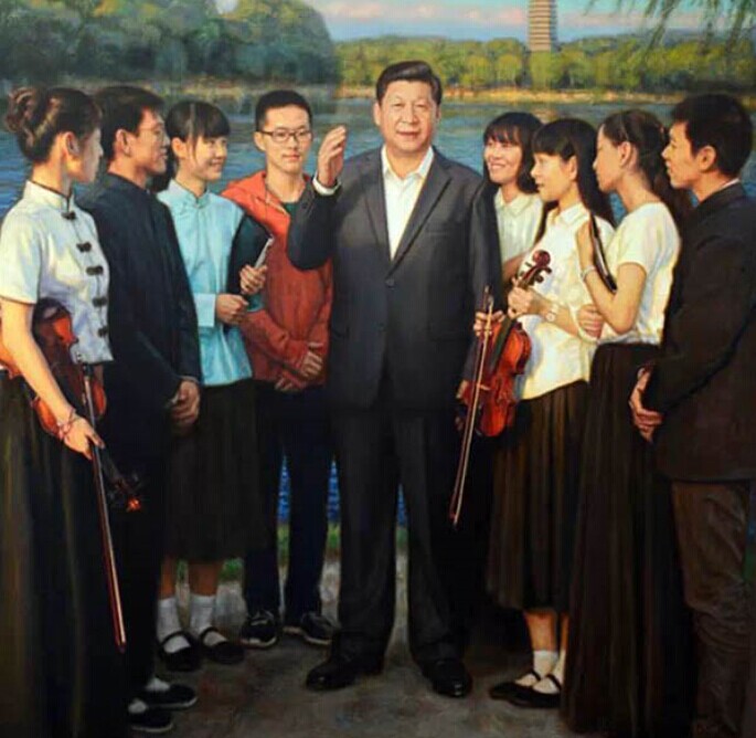 《未名湖畔》是国美油画系教师常青创作的特邀作品(250 X186厘米)。取材于2014年5月4日,习近平总书记考察北京大学,参加“北京大学纪念五四运动95周年青春诗会”后,在未名湖畔与青年学生交流中国梦和社会主义核心价值观的场景。