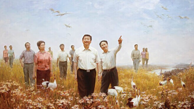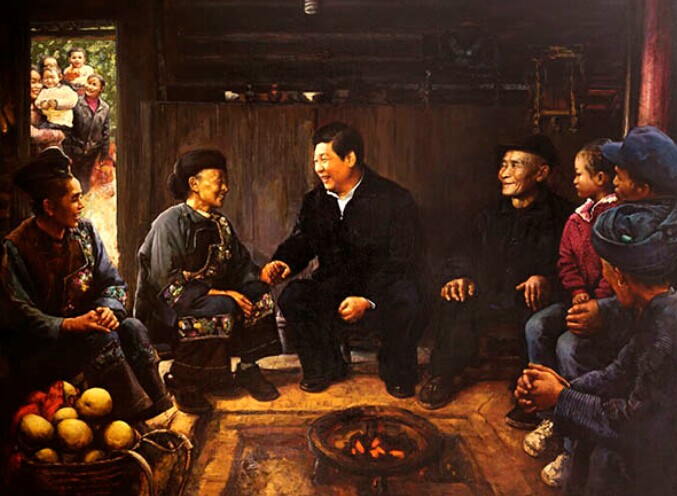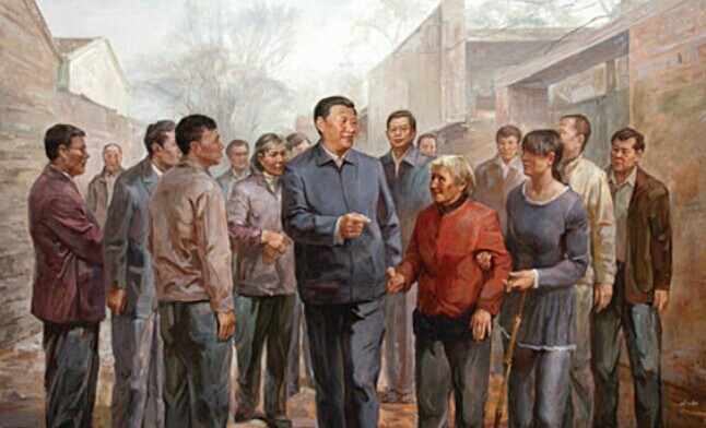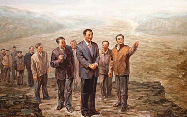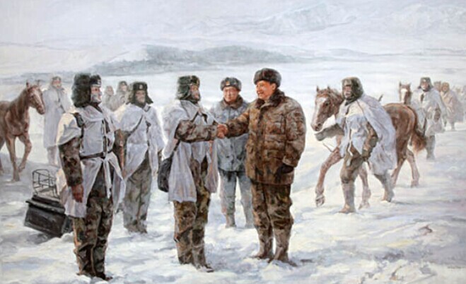 《银装素裹涌暖流》。油画家朱可广泛搜集习近平各时期的历史资料和照片,研读习近平在各个场合的讲话,创作了33幅巨幅油画,规格约为长4.2米、高2.5米,全方位、立体式地展现了习近平在时间跨度长达数十年,领域涉及政治、军事、教育、文化、外交等各个层面的
