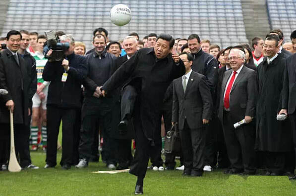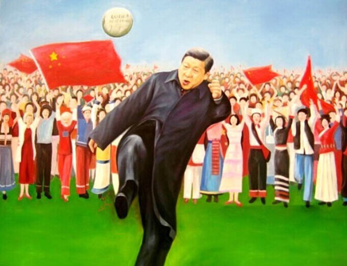 油画家王一的系列作品《中国梦•足球梦》,其中两幅是以2012年2月习总书记出访爱尔兰试踢足球为蓝本,这里展示的是更换背景的作品,表现了习总书记对足球的喜爱和娴熟的脚法。