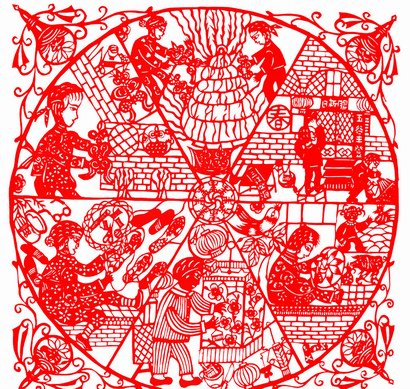 所有准备工作中,剪贴窗花是最盛行的民俗活动。内容有各种动、植物等掌故,如喜鹊登梅,燕穿桃柳,孔雀戏牡丹 ,狮子滚绣球 ,三羊(阳)开泰,二龙戏珠,鹿鹤桐椿(六合同春),五蝠(福)捧寿,犀牛望月,莲(连)年有鱼(馀),鸳鸯戏水,刘海戏金蝉,和合二仙等等。