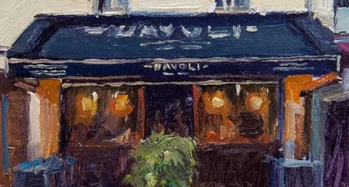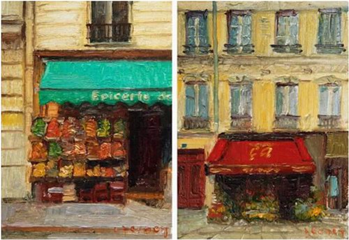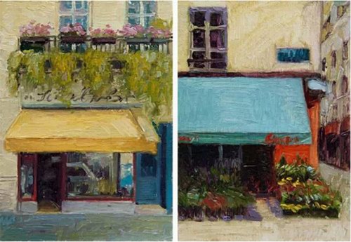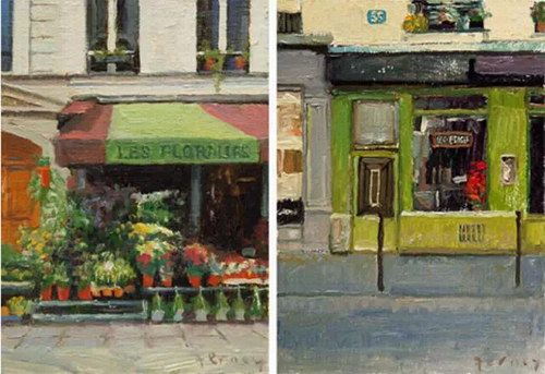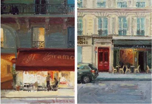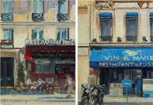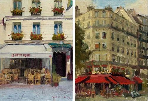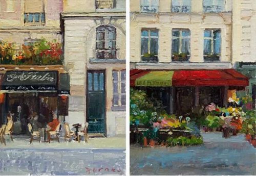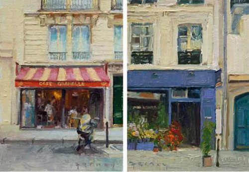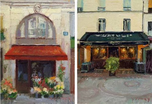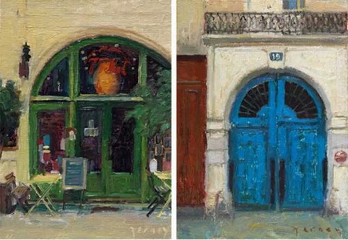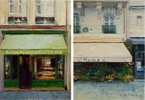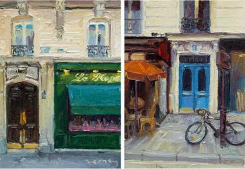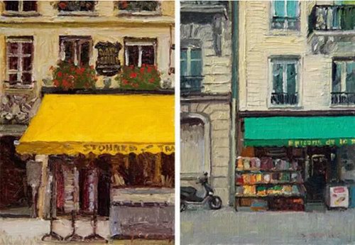 艺术家Poul就将这美景收入画笔中,用油墨色彩诠释了他眼中的小小巴黎。受其艺术家母亲的教导和影响,Paul注重细节,欣赏艺术,也成为一名出色的艺术家,油画是他的爱好和特长。光线,自然,动感都成为他的创作灵感。文中的每一幅作品都是他经过的建筑和商店,大部分关闭着,剩下各色的门和空空的座椅,巴黎在他的笔下呈现出安静慢调的模样,仿佛一个喷嚏就能够吵醒这座昏昏欲睡的城市。