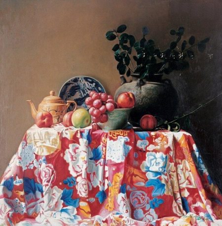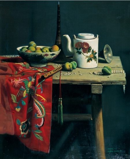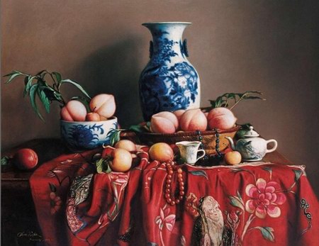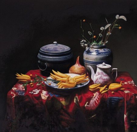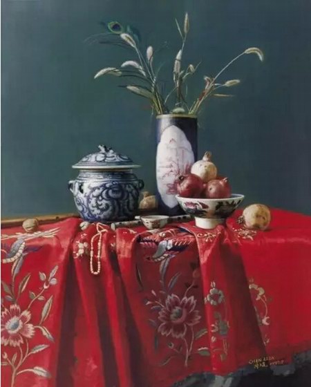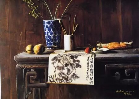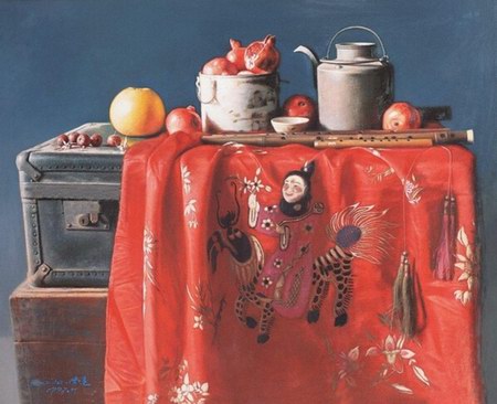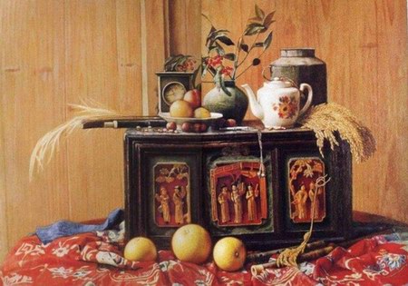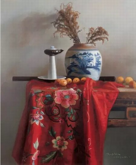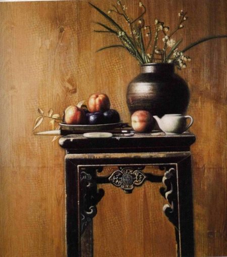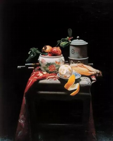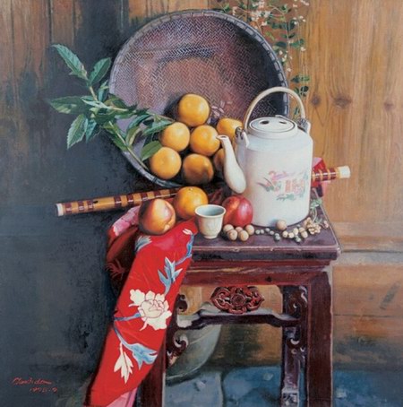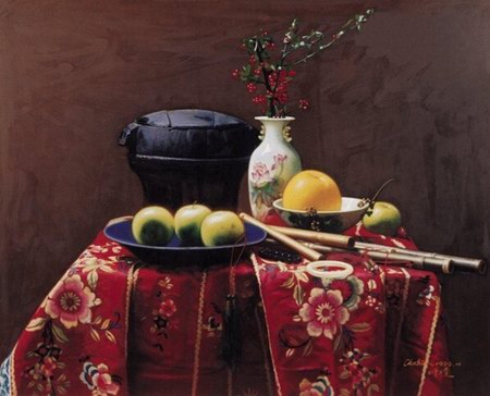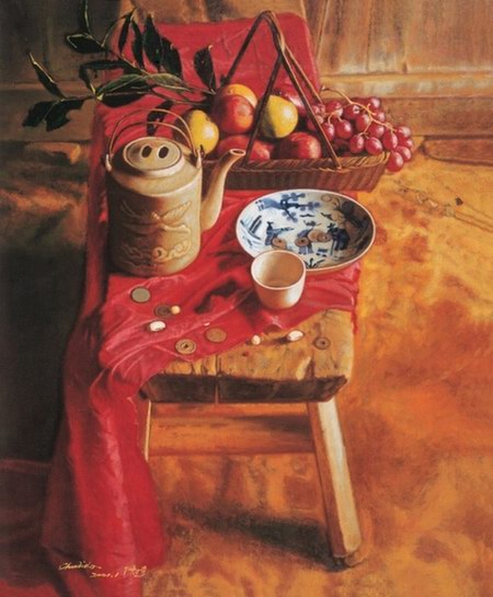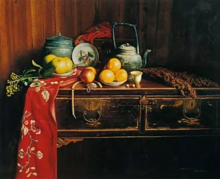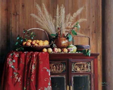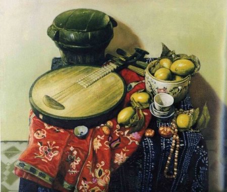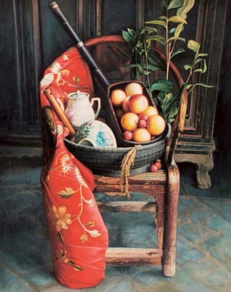 老皮箱、插着石榴枝的凤尾尊、案端书法、胡柚、柿子与无患子、竹、木、瓷、撒落红绡缎、月琴、佛手与狗尾巴花、柜上的火笼与油灯、板胡与首饰盒、篾萝与陶缸,以及春日的回光和我对桥下月影的思念。